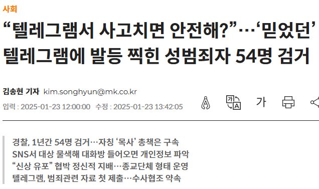 2025.1. 텔레그램 자칭 '자경단'('목사', '목사방)' 다단계 조직형 성범죄자 54명 검거사건 본문