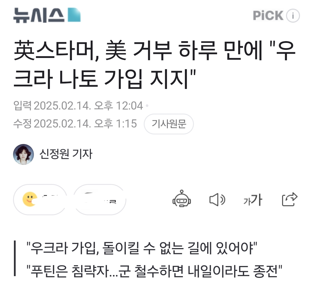 키어 스타머 영국 총리는 미국이 우크라이나의 북대서양조약기구(NATO·나토) 가입을 거부한 지 하루 만인 13일(현지 시간) 가입을 지지한다는 입장을 재확인했다고 폴리티코 등이 보도했다. 스타