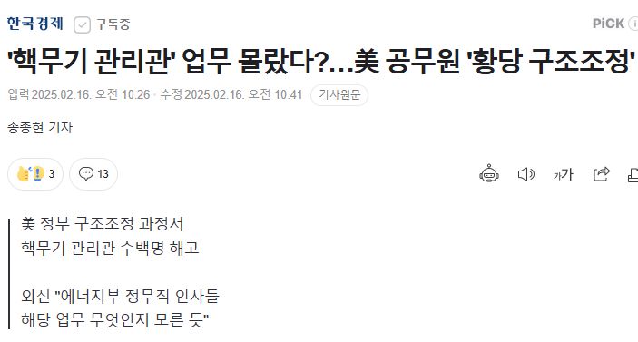 미국 주요 언론매체들에 따르면 트럼프 행정부는 에너지부(DOE)에 대한 구조조정 와중에 소속기관인 국가핵안전청(NNSA) 소속 직원 1800명 중 300여명을 지난 13일(현지시간) 밤에 해고하고 정부 이메일 계정도 박탈했다. (......) 정권교체 후 DOE에 부임한 정무직 고위인사들이 저성과 명목으로 NNSA 수습직원들을 해고하도록 인사관리 부서에 압박 (......) NNSA는 핵무기 관리·감독 업무를 담당하는 기관으로, '핵과학의 군사적 응용을 통한 국가안보 수호'가 설립 목적이다. CNN은 구조조정을 실시한 사람들이 NNSA의 담당업무가 무엇인지 몰랐던 것으로 보인다는 관계자들의 말을 전했다. (......) "NNSA가 핵무기 관리·감독을 한다는 사실을 DOE가 진짜로 몰랐던 것처럼 보여서 의회가 질겁하고 있다" (......) - 한국경제신문