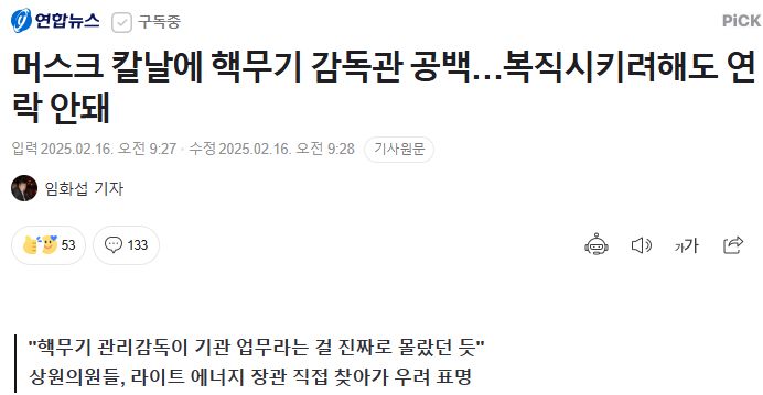 머스크 칼날에 핵무기 감독관 공백…복직시키려해도 연락 안돼