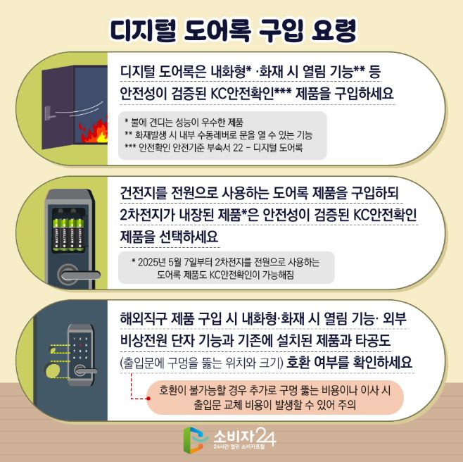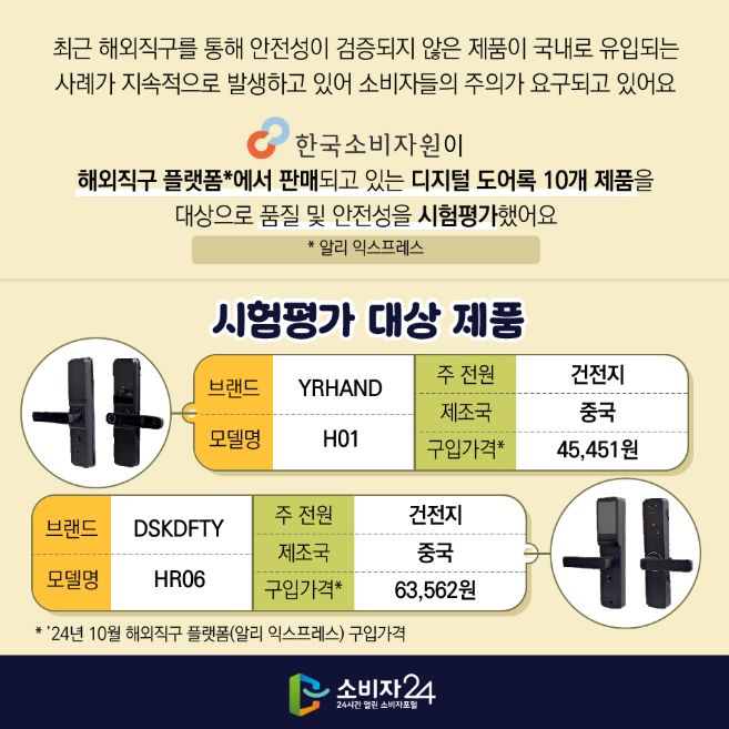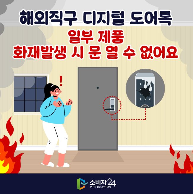 해외직구 디지털 도어록, 일부 제품 화재발생 시 문 열 수 없어요 최근 해외직구를 통해 안전성이 검증되지 않은 제품이 국내로 유입되는 사례가 지속적으로 발생하고 있어 소비자들의 주의가