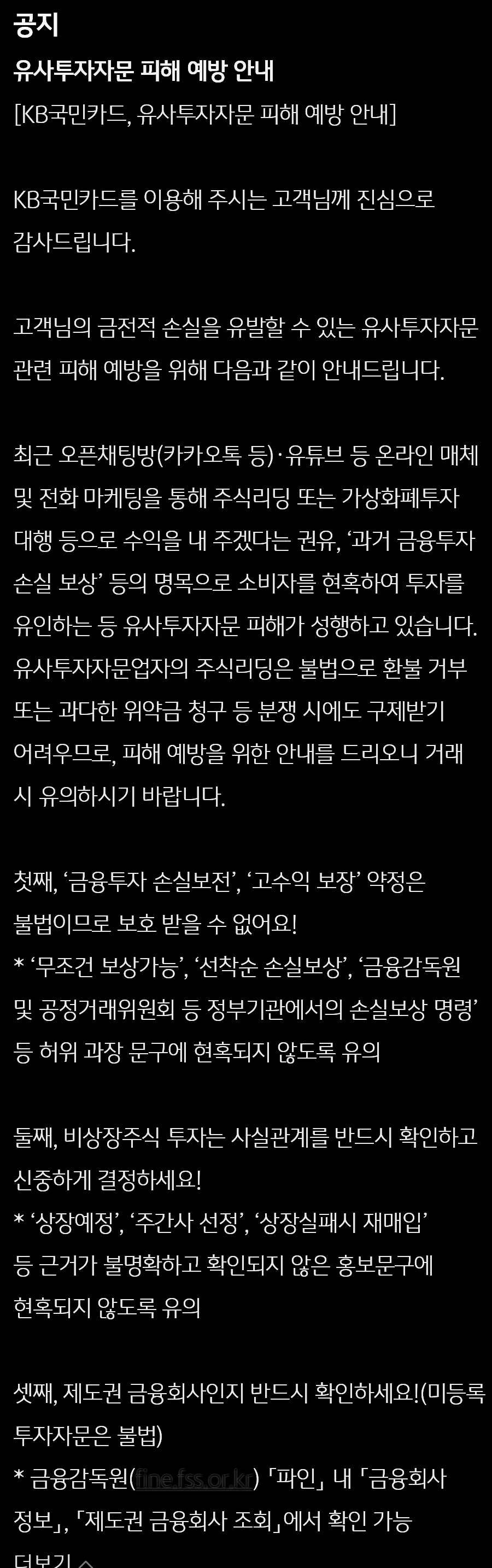 KB증권, 유사투자자문(리딩방, 투자대행, 금감원사칭 손실보상도움낚시 등) 주의 안내 본문