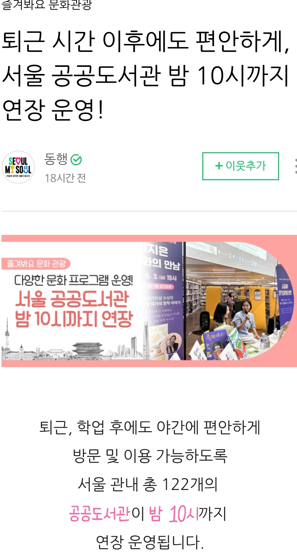 퇴근, 학업 후에도 야간에 편안하게 방문 및 이용 가능하도록 서울 관내 총 122개의 공공도서관이 밤 10시...