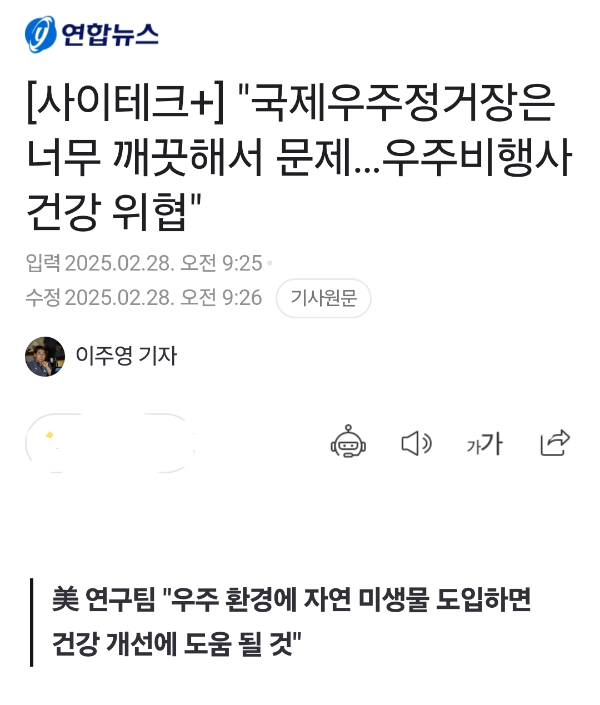 "국제우주정거장은 너무 깨끗해서 문제…우주비행사 건강 위협" ㅡ 연합뉴스 2025.2.