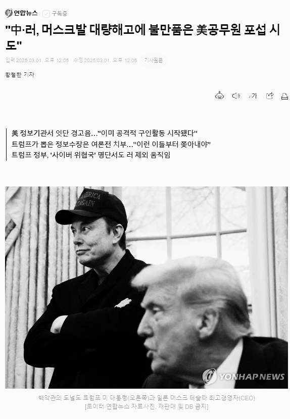 "中·러, 머스크발 대량해고에 불만품은 美공무원 포섭 시도"