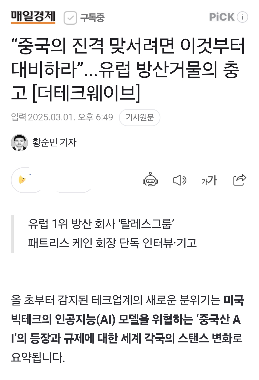 “중국의 진격 맞서려면 이것부터 대비하라”...유럽 방산거물의 충고 - 매일경제 2025.3.1.