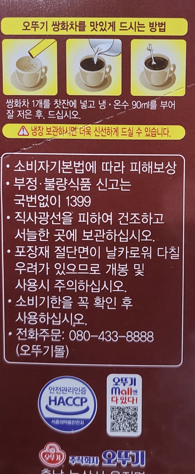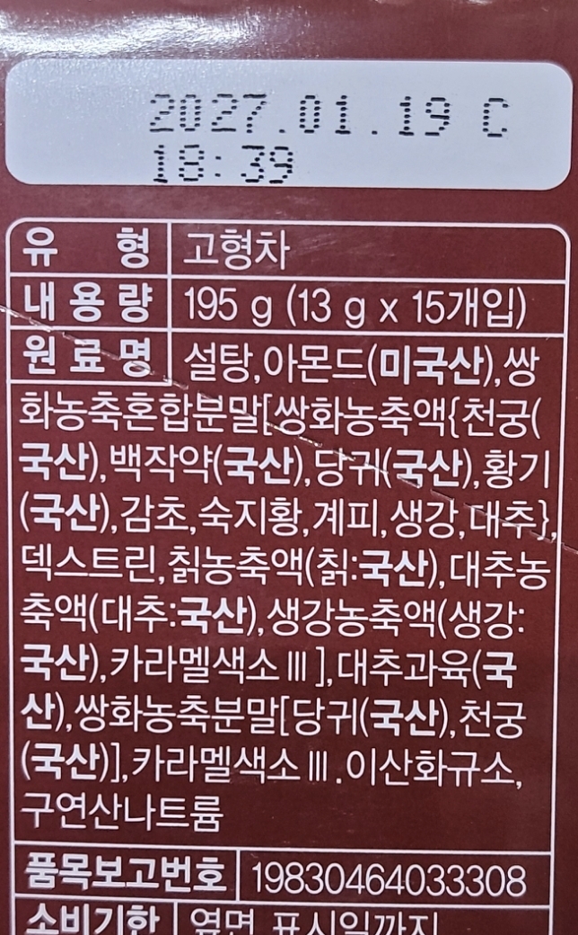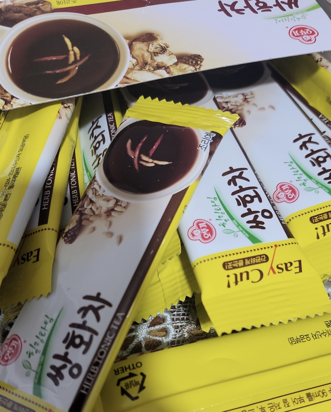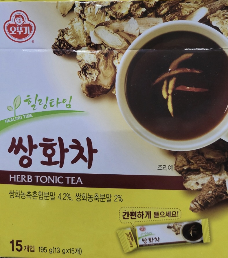 - 오뚜기삼화는 1포애 13그램. 다른 브랜드는 14-17그램도 있다. 이 제품은 영양표시가 없어 모르겠는데 이런 쌍화차제품의 당함량은 보통 1포에 8-11그램 정도인 듯. 그러니까 10그램 내외가 보통. [본문으로]