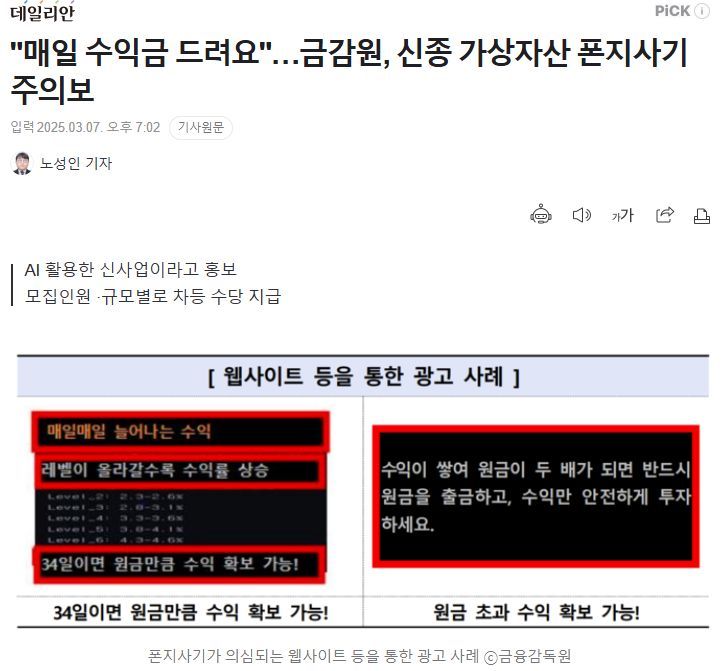"매일 수익금 드려요"…금감원, 신종 가상자산 폰지사기 주의보