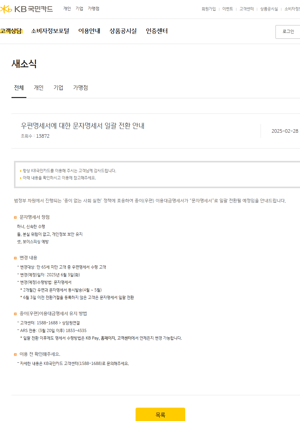 제목 : 우편명세서에 대한 문자명세서 일괄 전환 안내 조회수 : 13875 날짜 :2025-02-28 내용 : 항상 KB국민카드를 이용해 주시는 고객님께 감사드립니다. 아래 내용을 확인하시고 이용에 참고해주세