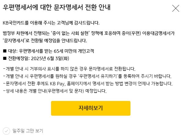 KB국민카드, 명세서 수령방법 종이→문자 로 일괄 변경 본문