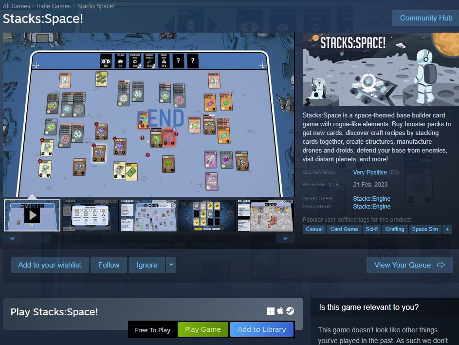 Stacks:Space is a space-themed base builder card game with rogue-like elements. Buy booster packs to get new cards, discover craft recipes by stacking cards together, create structures, manufacture drones and droids, defend your base from enemies, visit di