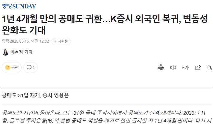━ 공매도 31일 재개, 증시 영향은 공매도의 시간이 돌아온다. 오는 31일 국내 주식시장에서 공매도가 전격 재개된다. 2023년 11월, 글로벌 투자은행(IB)의 불법 공매도 적발을 계기로 전면 금지한