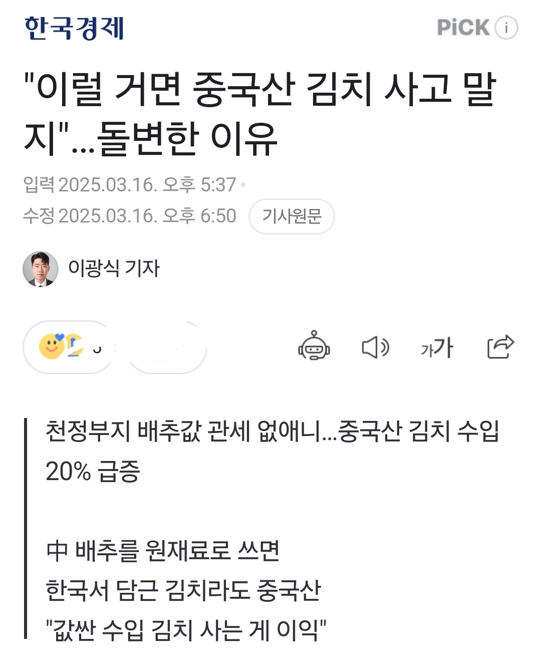 (그래서 어차피 시장에서 중국산 취급이니 저울질해서 직수입을 해버리는.. 똑같이 "중국산"이라고 표시해야 하는 김치판매업체나 그거 받아쓰는 식당이나 급식업체 입장에서는 그렇다고. 대신 국내 김치공장들이 문닫고 죽는거죠.