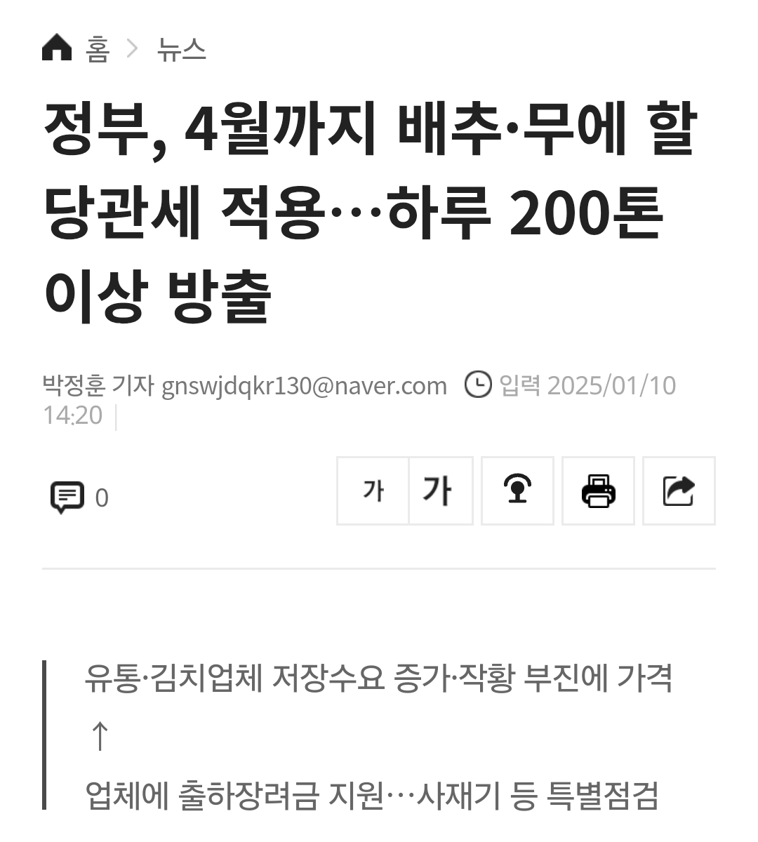 ㅡ 2024.5월부터 적용한 배추 할당관세를 이날 설 물가대책으로 봄배추 출하 전까지 없앤 것인 모양.