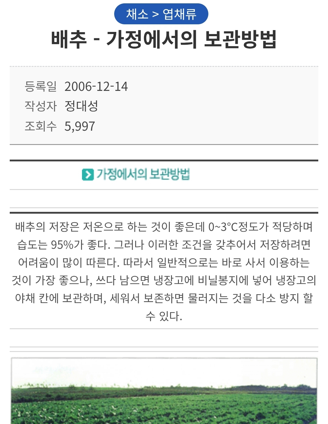 ㅡ 농진청 농사로. 가정에서의 배추보관법.