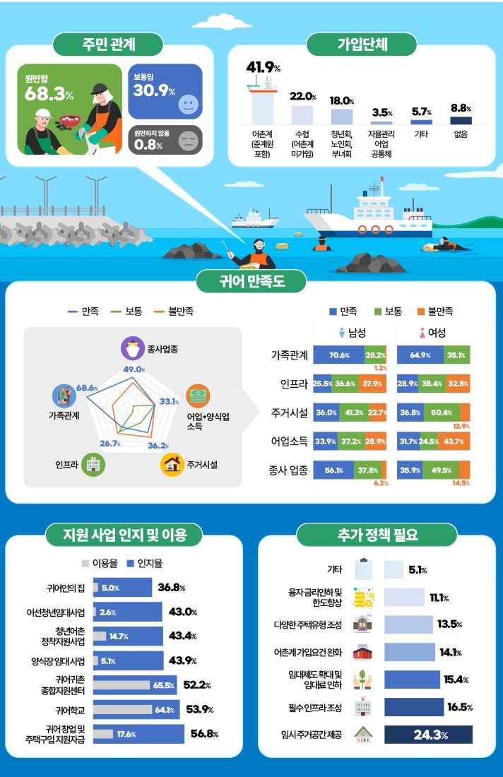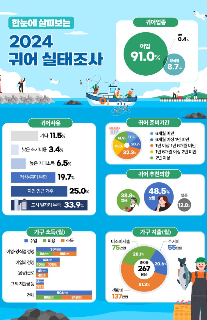 2024년 귀어 실태조사 결과 발표- 귀어인 10명 중 7명 주민관계 '원만'으로 귀어인 정착 실태 양호- 귀어 첫해 월평균 가구소득 347만 원으로 어가 월평균 소득의 76% - 정책브리핑 | 브리핑룸 | 보도