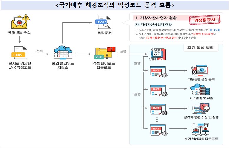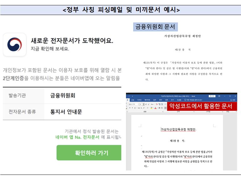 ㅇ 특히, 가상자산에 대한 사회적 관심이 높아지고 있는 상황에서 금융당국의 가상자산 관련 문서로 위장한 악성코드를 이용해 가상자산에 관심 있는 금융소비자의 정보를 탈취하고 단말기를 장악하거나 가상자산거래소 직원을 표적으로 하는 등 가상자산 관련 정교한 공격이 지속적으로 발견