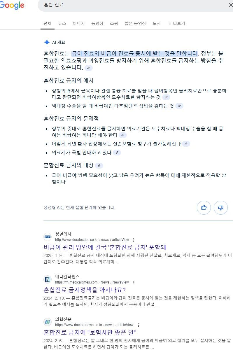 구글 검색: 혼합진료. 요즘은 AI정리가 먼저 올라온다. (단, 일반적인 이야기인데, AI의 오동작/실수로 출력한 문장에 대해 면책조항을 붙여놓은 것처럼 가끔 틀린 소리도 하는 모양이니 잘 봐야 한다) 기사를 좀 읽어보니, "혼합진료"는 원래 일본에서 사용하는 용어다.1