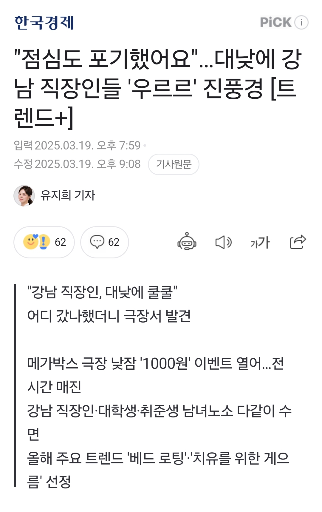 "진짜 자는 거야?" 영화관 출입구 앞에서 나누는 대화 속엔 반신반의하는 분위기가 감돈다. 하지만 입장 후 풍경은 달랐다. 19일 점심시간을 앞두고 서울시 강남구 메가박스 강남점 상영관 앞에