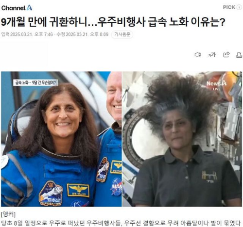 1965년생이고 59세? 60세?라니까 이상하게 노화했다고 하기보다는 원래 모습에 가까울지도. 단, 기사 밑에 과학자들이 얘기하듯, 무중력 우주생활이 오래되면 몸이 변한다니까 그것도 있을테고..