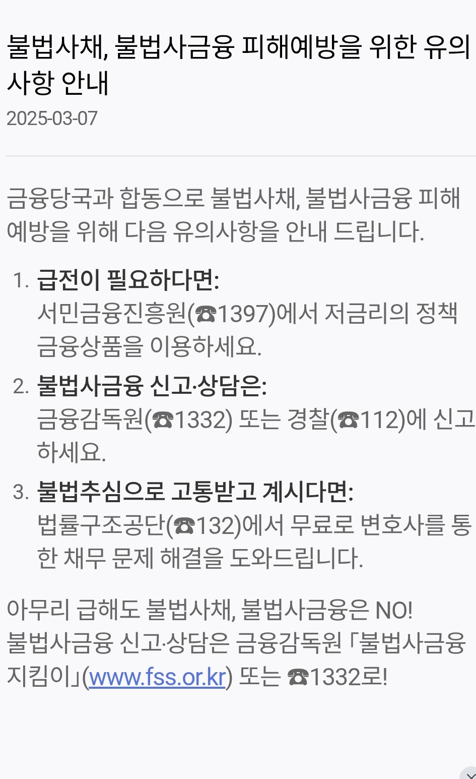 하나은행) 불법사채, 불법사금융 예방을 위한 유의사항 안내 본문