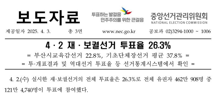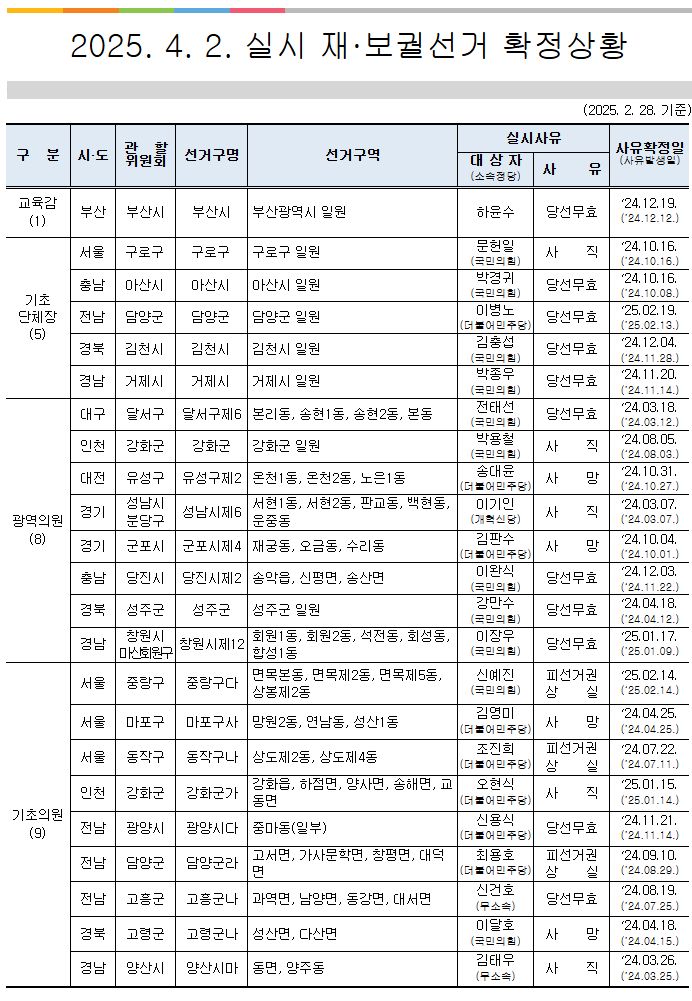 2025.4.2. 재, 보궐선거, 확정 선거구 목록
