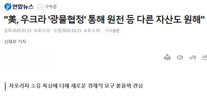 "美, 우크라 '광물협정' 통해 원전 등 다른 자산도 원해"