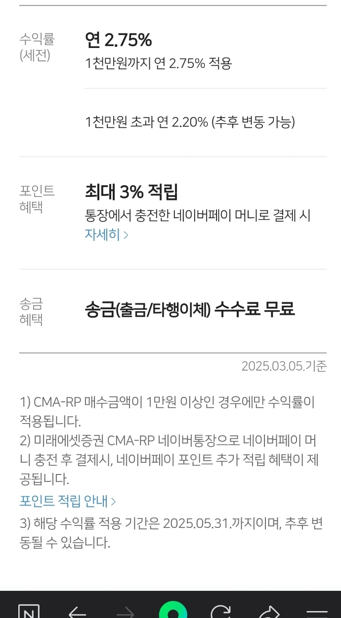 미래에셋증권 CMA-RP 네이버통장 금리(2025.3.26) 본문