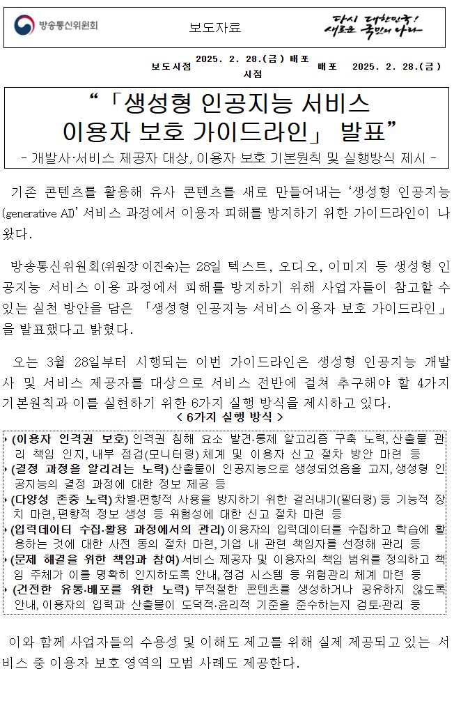 방송통신위원회, 생성형 인공지능 서비스 이용자 보호 가이드라인(2025.2.29) 본문
