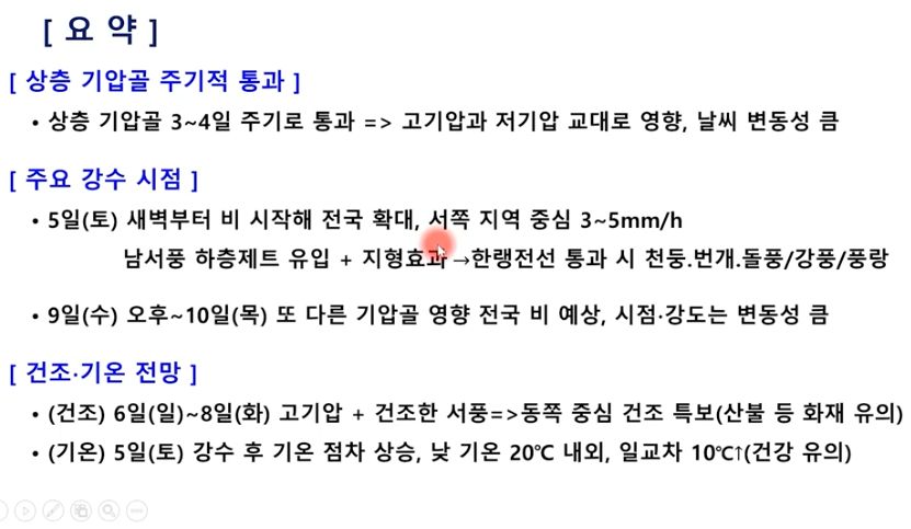 다만 5일 비는 중부지방 5~20mm (주로 5mm)라지만 전체적으로 많이 오지는 않고 날씨는 여전히 건조할 것이라고.