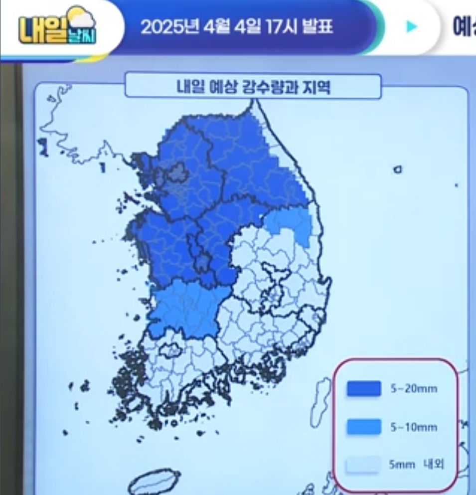 2025년 4월 4일 17시 예보를 해설한 내일날씨입니다.