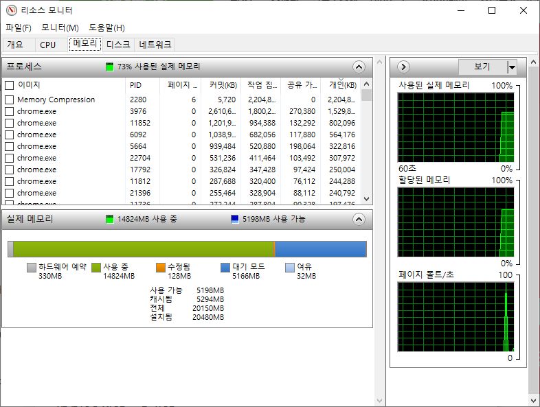 검색해보니, Memory Compression는 Windows10에서 새로 추가된 메모리 압축 기능이었다. 어떤사람들은 4000스레드를 잡아먹고 있었다고 하는데 나는 고작 42스레드 정도였다. 그리고 메모리는 280MB정도 잡