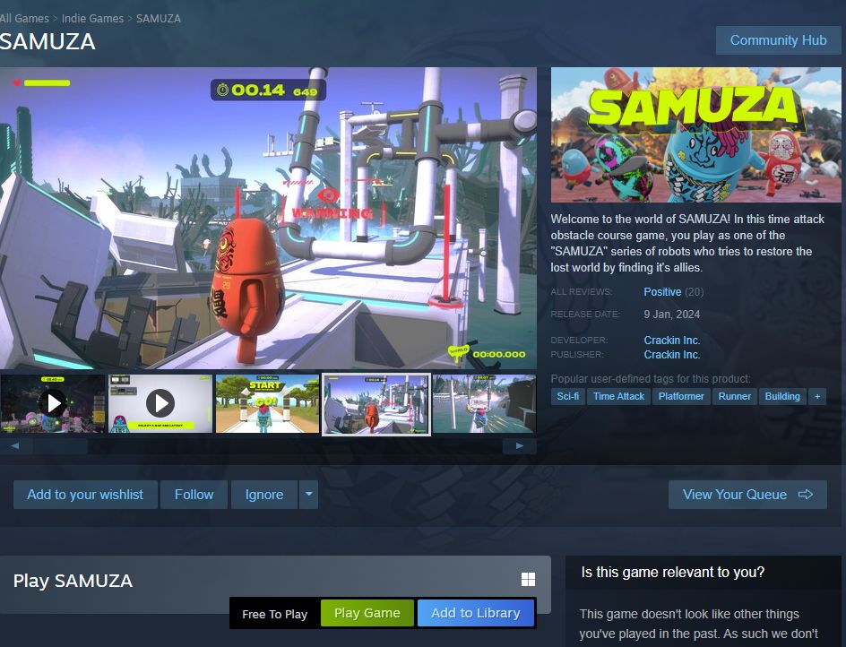 Welcome to the world of SAMUZA! In this time attack obstacle course game, you play as one of the "SAMUZA" series of robots who tries to restore the lost world by finding it's allies.