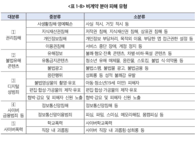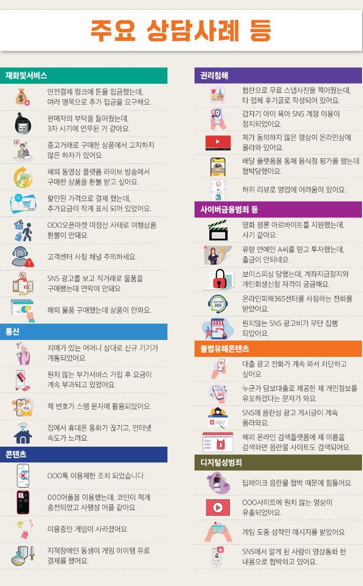 ▲재화 및 서비스 ▲통신 ▲콘텐츠 ▲권리침해 ▲사이버금융범죄 등 ▲불법유해 콘텐츠 ▲디지털 성범죄 ▲사이버 폭력 등 8가지 분야에 대해 실제 피해 사례와 예방 수칙, 대처방안 등이 담겼다.