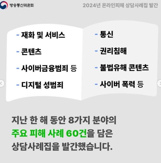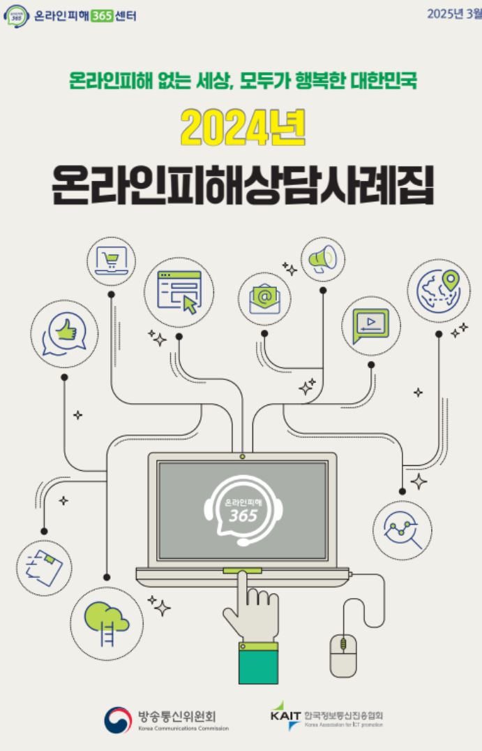 방송통신위원회(위원장 이진숙)와 한국정보통신진흥협회(회장 유영상)는 31일 작년 한 해 동안 ‘온라인피해365센터’에 접수된 피해 상담건 중 주요 피해사례 60건을 선정, 정리해 「2024년 온라인피해상담사례집」을 발간했다.