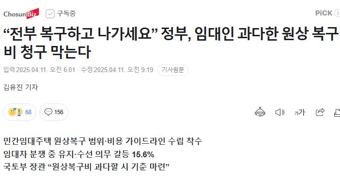 “전부 복구하고 나가세요” 정부, 임대인 과다한 원상 복구비 청구 막는다