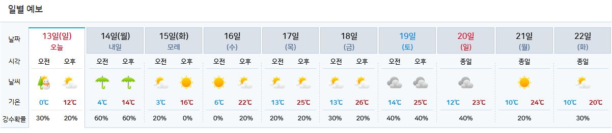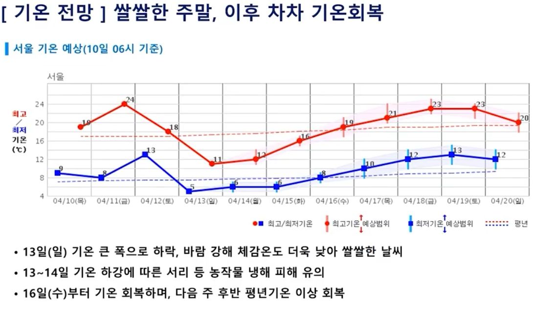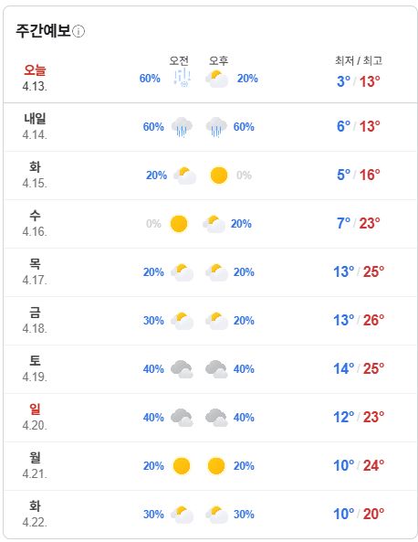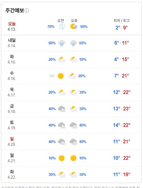 2025.4.13.일. 아주 쌀쌀한 아침. 이후 평년 기온으로. ~4.22.화. 본문