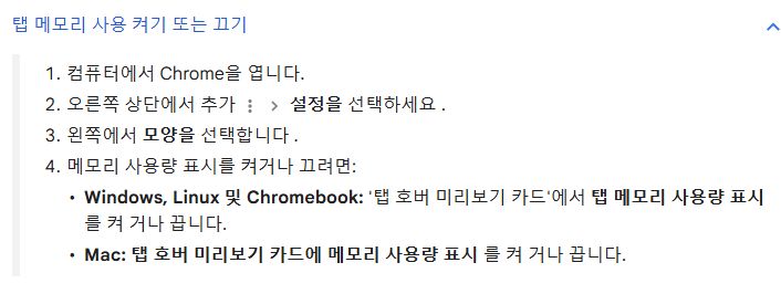 탭에 커서를 가져가면 탭 썸네일 아래에 그 탭이 사용하는 메모리가 얼마인지 표시해주는 기능.