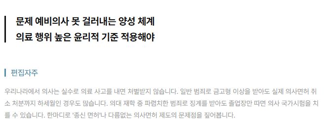 전문가들은 형사처벌 면제는 신중해야 할 뿐 아니라 의사 면허도 지금보다 더 엄격히 관리돼야 한다고 말한다. (......) "영리 목적이나 부정한 동기가 개입되면, 업무상 과실치사죄라도 면허가 취소될 수 있어야 한다"