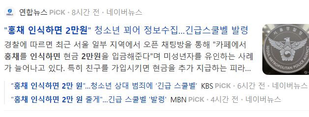 (......) 최근 서울 일부 지역에서 오픈 채팅방을 통해 "카페에서 홍채를 인식하면 현금 2만원을 입금해준다"며 미성년자를 유인하는 사례가 늘어나고 있다. 특히 친구를 가입시키면 현금을 추가 지급하는 피라미드 방식으로 운영되고 있어 민감정보가 무분별하게 수집되고 범죄에 악용될 가능성이 있다고 경찰은 지적 (......)