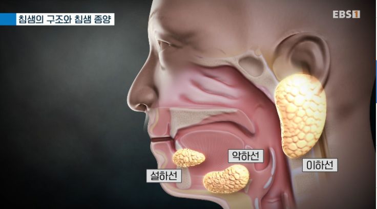 침샘이 피부 아래에 있기때문에 종양이 생기면 손으로 만져진다. 잘 살피자. (귀 뒤라고는 하지만 꼭 귀밑은 아닐 수도 있다.)