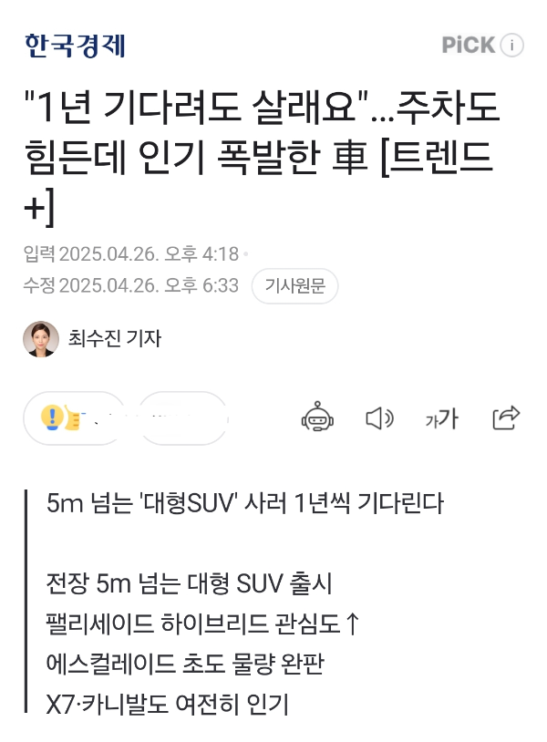 (......) 국내 도로 상황이나 주차공간이 대형차 운전에 녹록지 않음에도 불구하고 5m 넘는 대형 SUV가 여전히 인기인 것은 실내 공간을 중시하는 트렌드 때문으로 보인다. 차를 단순 이동 수단을 넘어 집과 같이 하나의 '공간'으로 인식하면서 실내 공간의 크기가 중요해진 것이다. (......) - 한경 2025.4