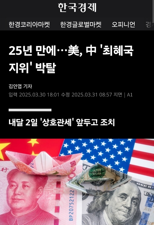 25년 만에…美, 中 '최혜국 지위' 박탈, 내달 2일 '상호관세' 앞두고 조치