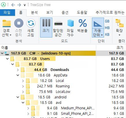안드로이드 스튜디오를 설치할 때 같이 깔린 것들이 남아서 몇십 기가를 먹고 있었네요.