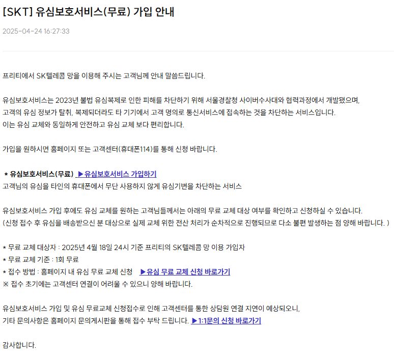 (프리텔레콤) [SKT] 유심보호서비스(무료) 가입 안내/:/ SKT망이용자 유심 무료 교체접수(2025.4.18까지 가입자) 본문