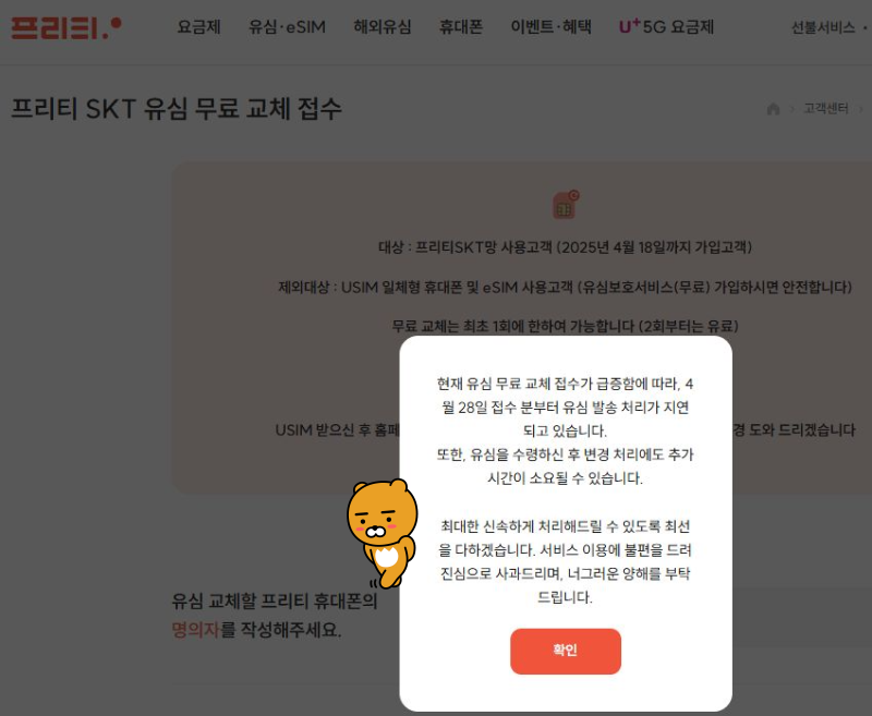 프리티 SKT 유심 무료 교체 접수