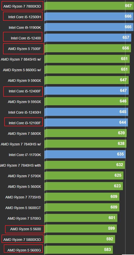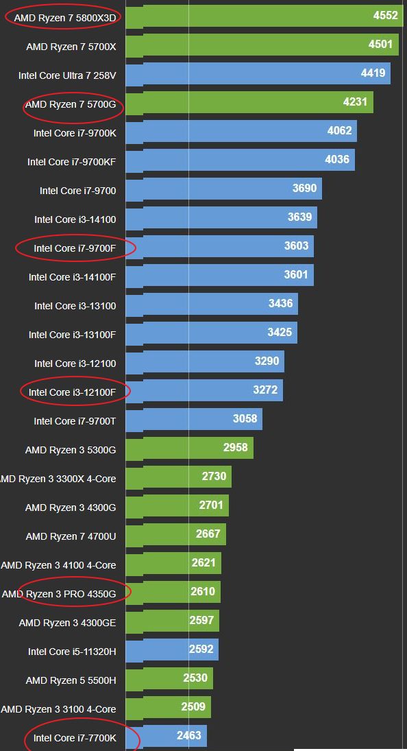 싱글코어성능기준, 7500F, 5600G, 12400, 12100F 같은 인텔, AMD (이젠 구세대지만 아직 신품 조립으로 팔리는) 보급형/미니PC용 칩의 절반 정도 숫자가 나온다.