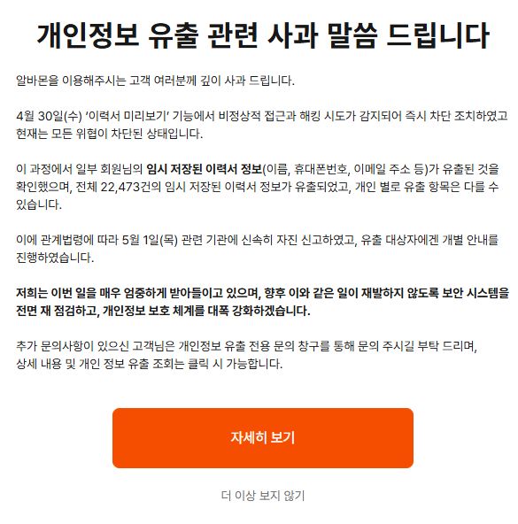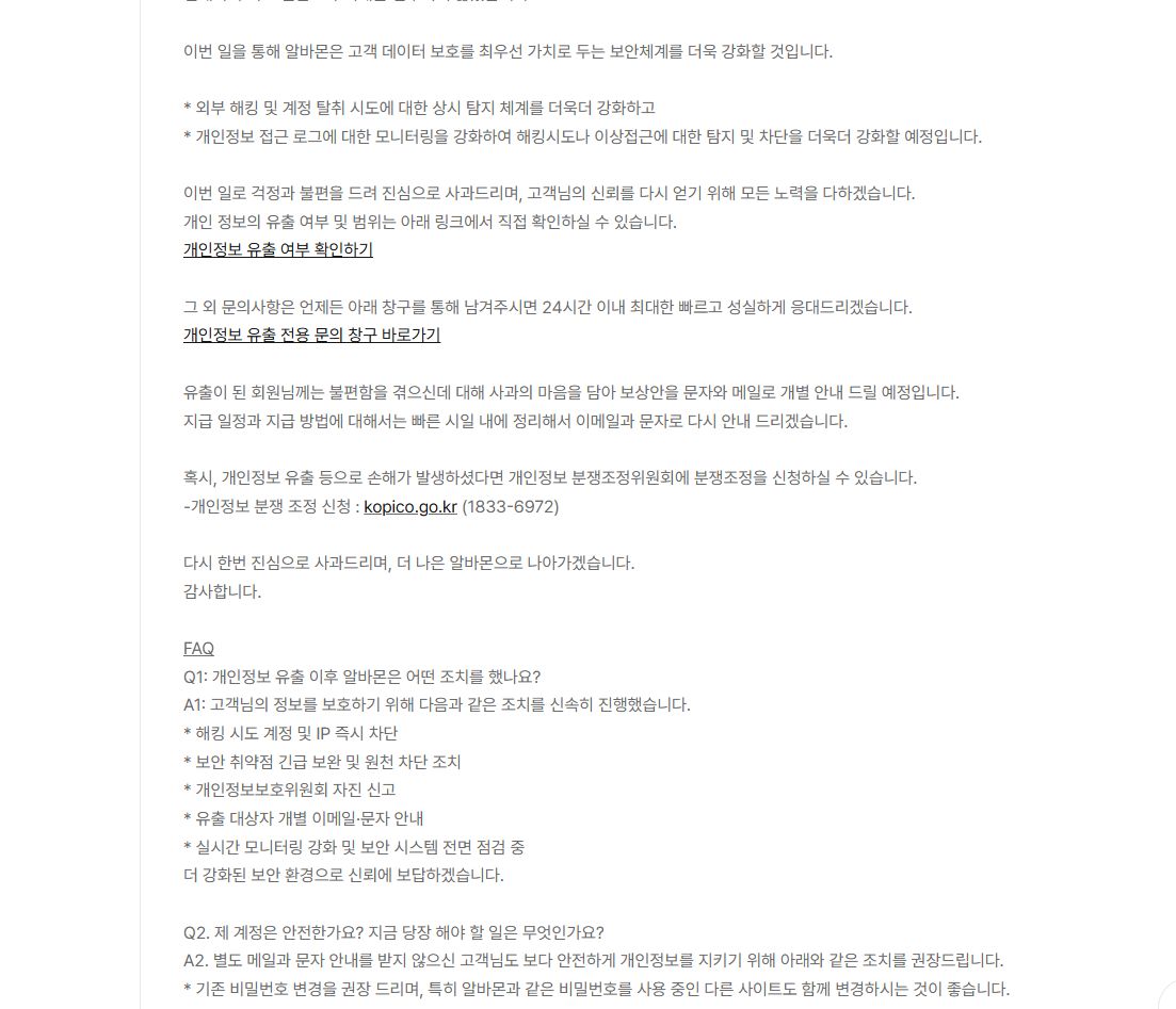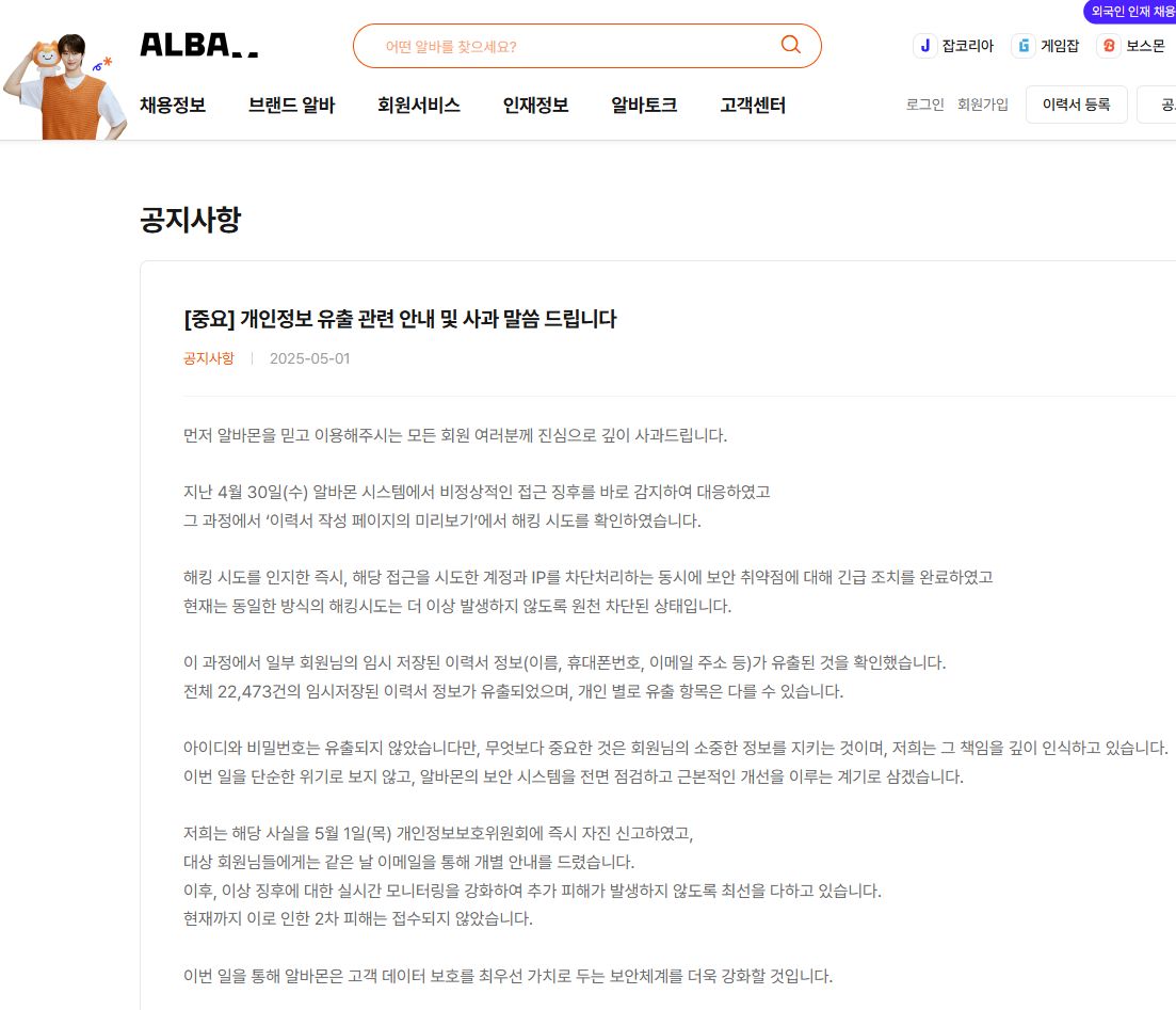 2025.5. 알바몬 개인정보 유출 공지 본문
