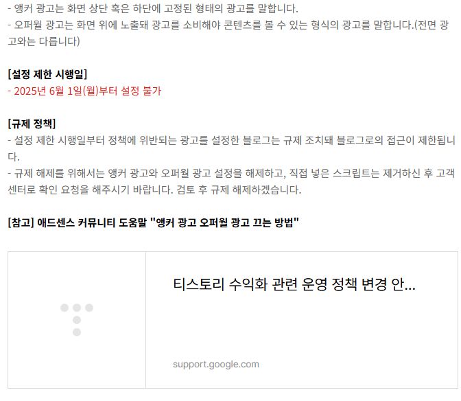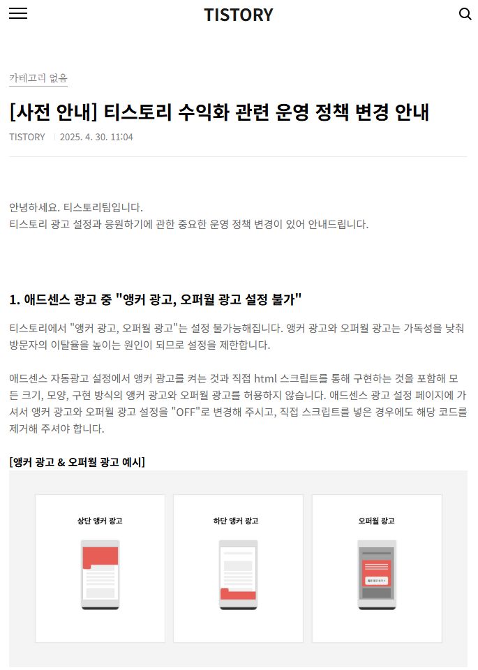 안녕하세요. 티스토리팀입니다.티스토리 광고 설정과 응원하기에 관한 중요한 운영 정책 변경이 있어 안내드립니다. 1. 애드센스 광고 중 "앵커 광고, 오퍼월 광고 설정 불가"티스토리에서 "앵커