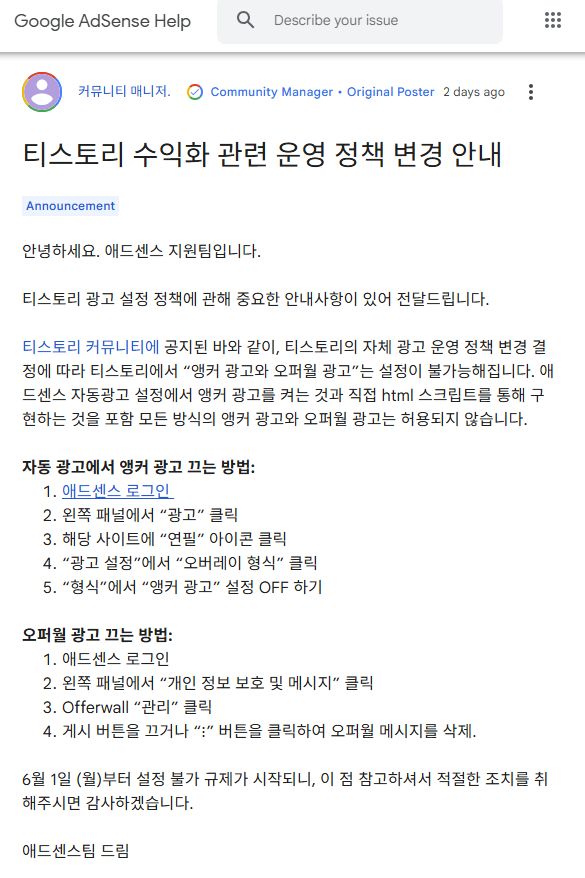 티스토리 수익화 관련 운영 정책 변경 안내 - Google AdSense 커뮤니티